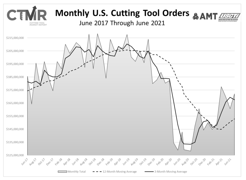 根據(jù)美國(guó)刀具協(xié)會(huì)(USCTI)和美國(guó)制造技術(shù)協(xié)會(huì)(AMT)的數(shù)據(jù),2021年6月美國(guó)刀具消費(fèi)總額為1.721億美元...