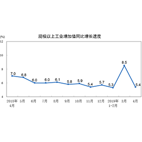 2019年4月份,規模以上工業增加值同比實際增長5.4%(以下增加值增速均為扣除價格...