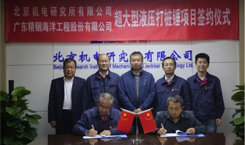 2019年10月22日,北京機電研究所有限公司梁豐收董事長與廣東精銦海洋工程股份有限公司董事長李光遠在北京機電研究所簽訂了3500KJ超大型全液壓打樁錘開發合同。該合同是機電所近年以來單臺套金額大的合同。