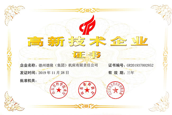 2019年11月底,山東普利森集團下屬德州德隆(集團)機床有限公司通過了國家級高新技術企業(yè)認定,2020年4月份獲得由山東省科學技術廳、山東省財政廳、國家稅務總局山東省稅務局聯(lián)合頒發(fā)的的 “高新技術企業(yè)”證書。
