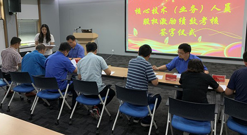 接著,隆重舉行了公司第三期限制性股票激勵計劃核心技術(業務)人員股權激勵績效考核簽字儀式。為健全公司長效激勵約束機制,充分調動核心骨干人員的積極性和創造性,有效提升核心團隊凝聚力和企業核心競爭力,將股東、公司和核心團隊三方利益有效結合,公司今年實施了第三期限制性股票激勵計劃。通過簽字儀式,進一步增強了激勵對象的主體責任意識,確保其完成年度績效指標,為公司年度經營目標和三年業績目標的達成而努力奮斗。