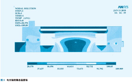 將計(jì)算出的熱源生熱率與傳熱系數(shù)加載在有限元模型上,求解出環(huán)境溫度為25℃,電主軸的轉(zhuǎn)速為14000r/min時(shí)電主軸的穩(wěn)態(tài)溫度場(chǎng)如圖3所示。