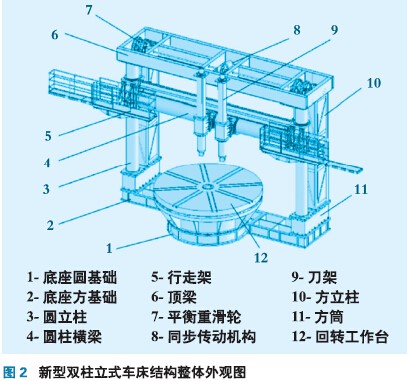 針對現有傳統技術設計一種新型的雙柱立式車床,其整體外觀如圖2所示,主要包括底座、圓立柱、橫梁、行走架、頂梁、同步傳動機構、刀架、方立柱和工作臺等部分。