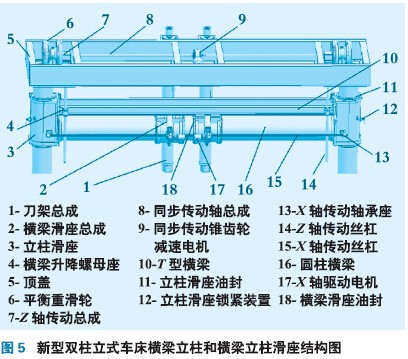 在傳統雙柱立式車床的基礎上創新設計了橫梁,新型雙柱立式車床的橫梁有圓柱橫梁和T型橫梁組合而成,如圖5所示,分別聯接安裝在立柱滑座上,可以隨立柱滑座在圓立柱上做直線移動。