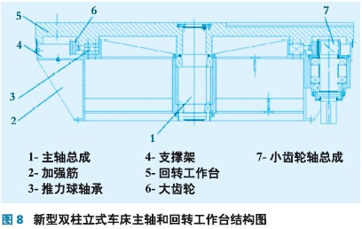 新型雙柱立式車床的回轉工作臺總成如圖8所示,它由主軸總成、支撐座、推力球軸承、回轉工作臺、大齒輪和小齒輪軸總成組成。與傳統雙柱立式車床不同,新型雙柱立式車床采用高精度、高強度大型推力球軸承為工作臺滾道,其自動定心好,在油池中工作,潤滑好,運動阻力小,不會因為安裝了偏心、偏重工件造成工作臺偏浮。相對傳統雙柱立式車床節能40%以上。