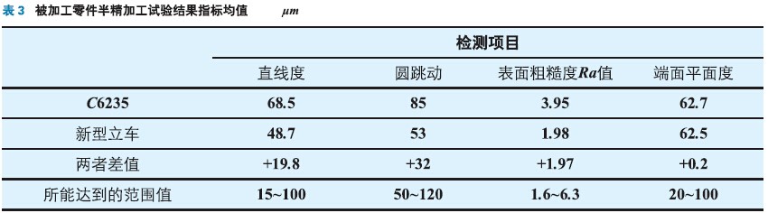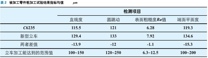 分別加工10件同尺寸的被加工零件,求得各項指標均值的結果列于表2、3中。從表2中可以看出,粗加工時被加工零件的直線度、圓跳動、表面粗糙度Ra 值和端面平面度,傳統雙柱立式車床均優于新型雙柱立式車床,其中端面平面度差值最大,其原因是滑動軸承比推力球軸承承受軸向載荷大,能承受切削過程中產生的較大的沖擊載荷,所以在粗加工時更有利于保證端面平面度。新型雙柱立式車床加工后的零件直線度、圓跳動、端面平面度和表面粗糙度Ra值均在立式車床所能達到的范圍值內,因此能夠適應立式車床粗加工的要求。