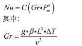 式中,C、n為常數由相關參考文獻查出;Gr為格拉曉夫準數;g為重力加速度;β為體膨脹系數:L為形狀特征尺寸;v為運動粘度;ΔT為流體與壁面溫差。