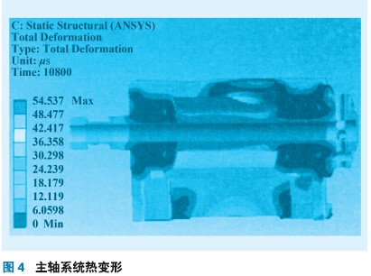 在有限元分析軟件ANSYS Workbench12中利用直接耦合順序耦合解方法,將得到的溫度場的溫度分布作為熱載荷加載到模型上,同時約束床頭箱體底部與床身接觸面的所有自由度,計算得到主軸系統的熱變形如圖4所示。