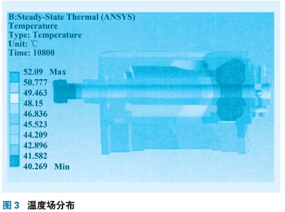 本文研究以主軸n=3000r/min機床最高工作轉速為計算依據,空轉3小時達到熱平衡狀態,根據前述計算公式,可以得到前軸承(靠近刀具端)發熱量為56.145W,后軸承(遠離刀具端)發熱量為48.73W;主軸內表面傳熱系數為213.667W/m2℃ 主軸外表面的傳熱系數為107.189W/m2℃,床頭箱內其他表面傳熱系數為9W/m2℃。將以上邊界條件約束到有限元模型上,得到主軸系統的溫度場分布如圖3。