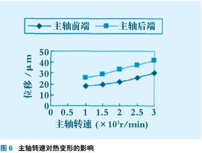 由上圖可知,前后軸承的溫升隨主軸轉速的增加而不斷增加,但并不完全是線性關系;且前軸承溫升大于后軸承,前軸承受主軸轉速的影響較大;隨著主軸轉速的提高,主軸前后端產生的綜合位移也隨著提高,且主軸后端熱變形量比前端要大。