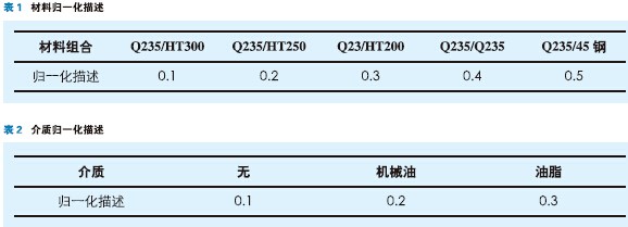 對于面壓和粗糙度分別用其各自最大值和最小值對面壓和粗糙度進行歸一化處理,而對于介質、材料來說,本文人為地對其歸一描述,如表1、2。