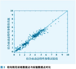 對神經網絡進行訓練的過程實際上是1個函數逼近過程,也就是對神經網絡內部的神經元之間相互作用的連接權不斷修改的過程。取誤差允許值為0. 0001,u=0. 01,初始化網絡權值向量W,在上述實驗得到的300組訓練數據中取其中90%作為訓練網絡樣本,10%的數據作為測試樣本。訓練誤差達到誤差控制精度后,對訓練樣本的網絡輸出與結合面動態特性參數試驗值的比較如圖2、3,圖中直線為預測值與實際值完全相等的的結合線,從圖中可以看出,數據點都分布在最佳結合線上或附近,所以說明本文采用的網絡拓撲結構是合適的。