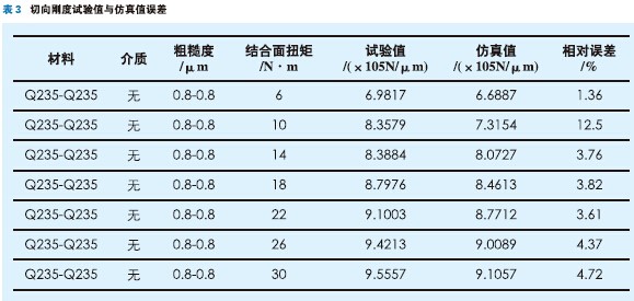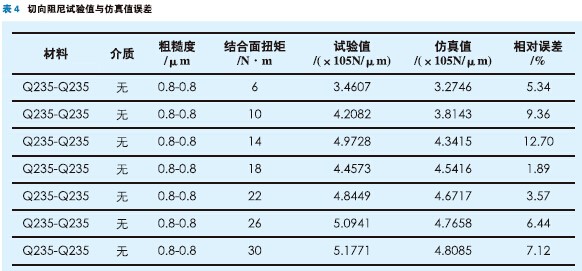 從60組試驗數據中選取1組,采用訓練好的結合面動態特性神經網絡模型在表3所示的結合狀態下進行仿真,結合面動態特性參數的試驗值和仿真值對比變化如圖4、5,仿真誤差見表3和表4。從圖中我們可以看出,結合面動態特性參數的試驗值和仿真值在量值和變化趨勢上吻合得較好,而且相對誤差大都在10%以內。
