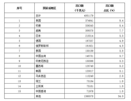由上表可見,按金額計算金屬加工機床出口去向前3位的國家和地區是美國(9.4%)、印度(8.4%)和越南(7.7%),三者合計約占25%。