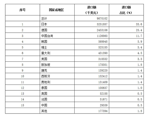 上表數據可見,按金額計算金屬加工機床進口來源前3位的國家和地區是日本(33.6%)、德國(25.4%)和中國臺灣(11.7%),三者合計超過70%。
