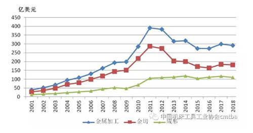 2018年金屬加工機床消費額達291.3億美元,同比微降2.8%。其中,金屬切削機床消費額181.1億美元,同比微降1.6%;金屬成形機床消費額110.2億美元,同比降低4.7%。2018年國內金屬加工機床市場容量略有下降。2001-2018年國內金屬加工機床消費額見圖8。