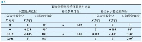 (5)X、Y、C 軸做大圓聯動,觀測并記錄X、Y 兩個方向隨著C 軸角度變化時,千分表讀數變化;