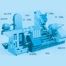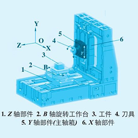 全球化的競爭迫使生產企業越來越重視產品的加工效率和精度,產品精度很大程度上由機床的精度所決定。五軸數控機床能實現對復雜異型曲面零件進行高速、高效、高精度加工,廣泛地運用在汽車、軍工、能源等行業,近年來越來越倍受機械加工行業的重視。五軸數控機床受幾何誤差、熱變形誤差、動態誤差等各種因素的影響,其加工精度往往很難滿足實際生產需求。通過更換高精度傳動部件和伺服控制系統來提高機床精度易受技術和生產成本等瓶頸的限制,因此對機床進行誤差補償已成為提高加工精度的一種有效方法。機床的誤差主要有空間運動學誤差、熱變形誤差、動力學誤差以及運動控制與控制算法誤差等,尤其是機床在加工過程中還存在熱變形誤差和承載變形誤差,并且這類誤差存在非穩定性和時序性,且分布較為復雜,因此,實現高精度誤差補償的關鍵技術是需要精確地建立數控機床綜合誤差的計算模型。目前,數控機床誤差的理論建模技術主要有幾何建模法、齊次誤差矩陣法等幾種。SheChenhua提出了一種通用型五軸機床誤差補償后處理模型,并有效地提高了補償精度。文獻和文獻中采用多體理論對五軸機床的幾何誤差和熱誤差進行了簡化與建模分析。Bohez 等提出了一種分離低階誤差分量的識別方法。盡管上述研究都取得了一定成果,但這些方法都存在著魯棒性差、數學表達式冗余復雜、誤差分量不確定、補償精度差等問題,并沒有從根本上解決機床誤差建模和機床誤差補償的問題。作者以五軸機床CGM4000 為研究對象,基于多體動力學建立了誤差綜合補償模型,尤其針對機床熱誤差,提出了5 點測量法和6 點測量法分別對主軸、進給軸進行熱誤差辨識。針對機床誤差的不穩定性,不完整性等“貧信息”特性,提出了變權系數灰色模型( variable weight GM( 1,n) ,簡稱VW - GM( 1,n) ) 擬合熱誤差值,建立機床熱誤差預測模型。基于上述算法開發了易于數控系統自動解算的誤差補償單元,并通過試切加工驗證了該補償算法的有效性。